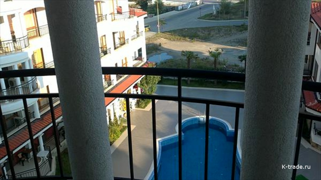 К студии примыкает просторный балкон. С балкона открывается вид на бассейн.